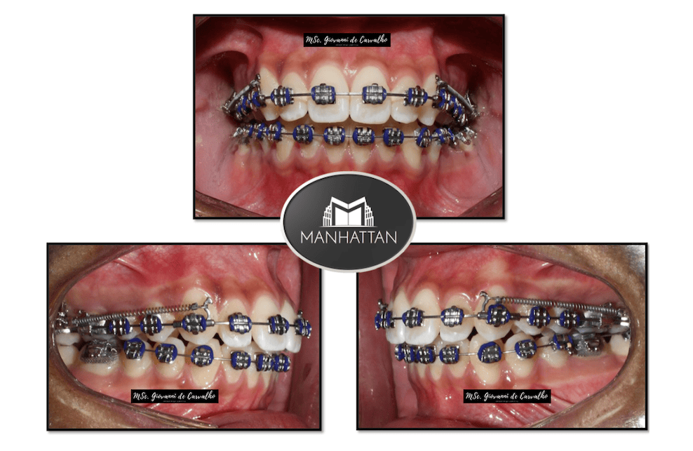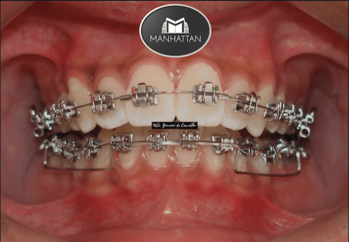 Começamos colocando o aparelho fixo tanto na parte de cima quanto na de baixo. É aquele aparelho tradicional, com braquetes e fios, que a maioria das pessoas já conhece.